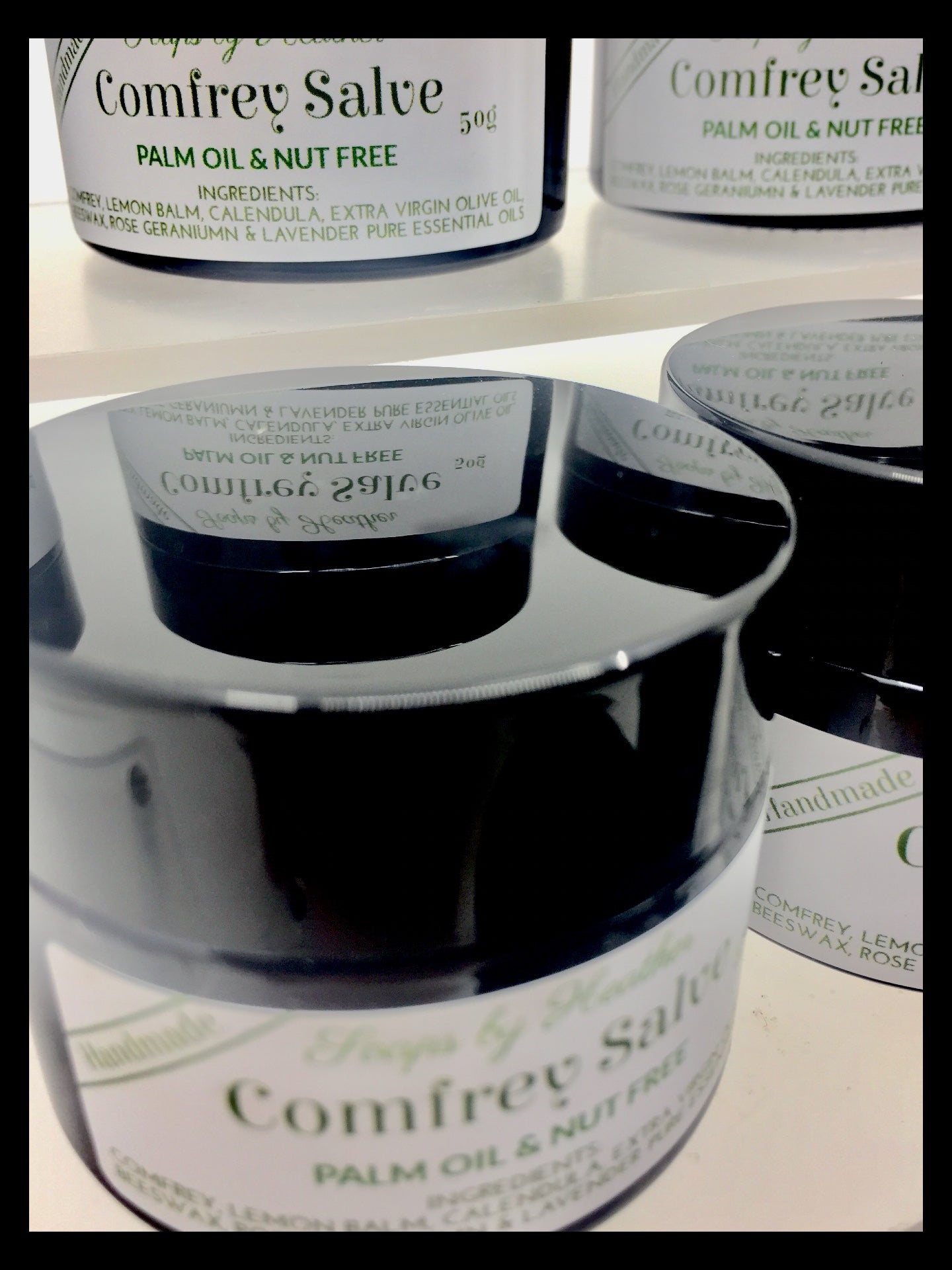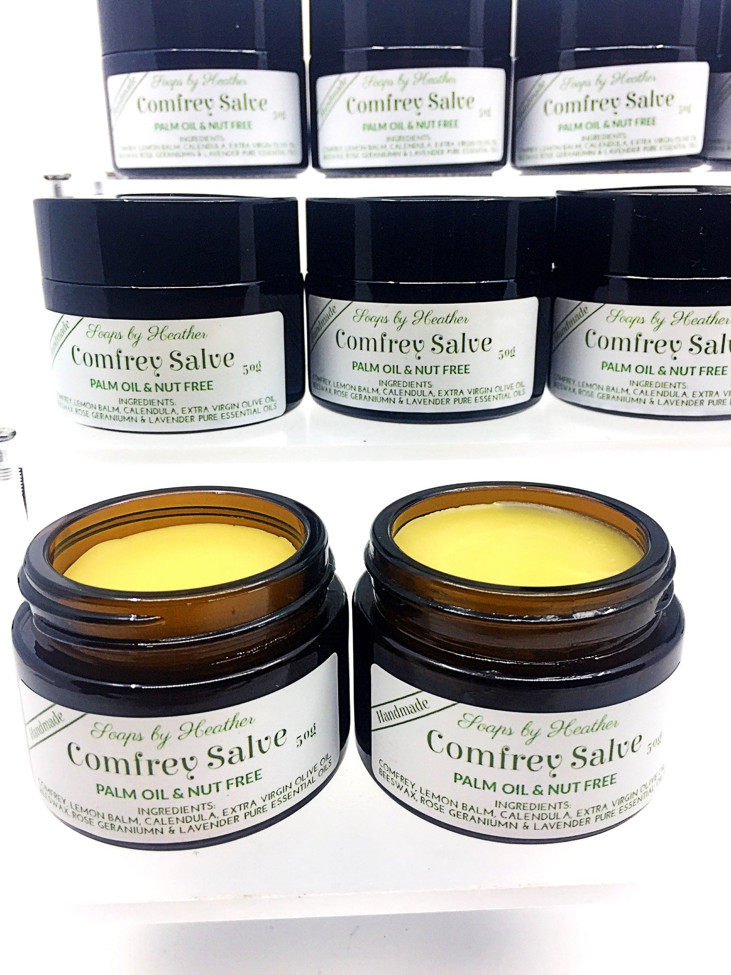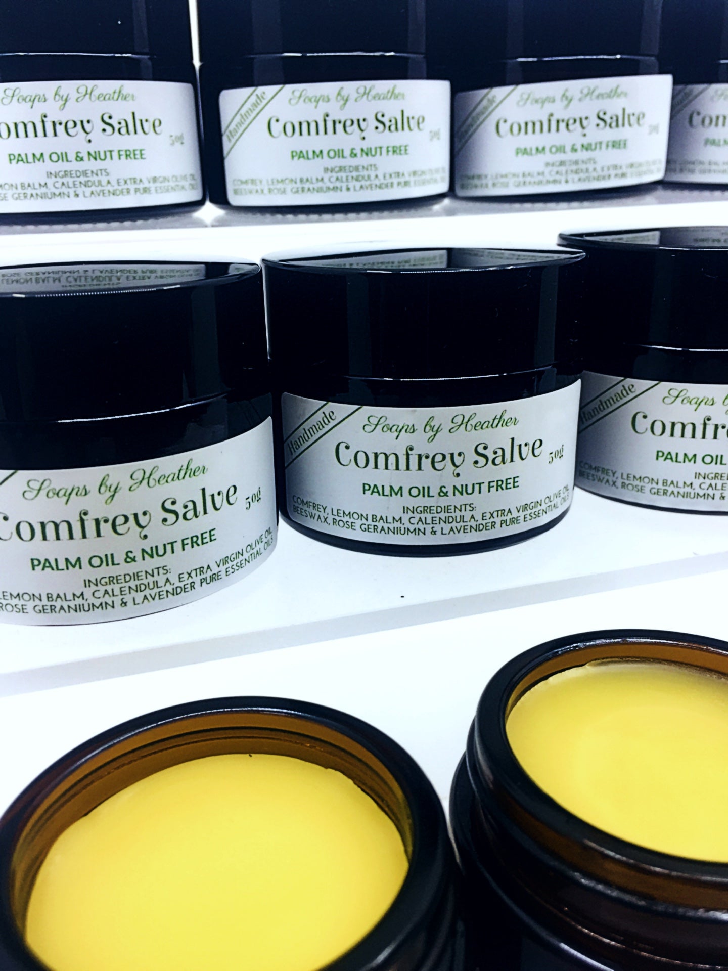 My comfrey salve is versatile. It may help to soothe and heal eczema, dermatitis, chafing, bruising, and sprains.